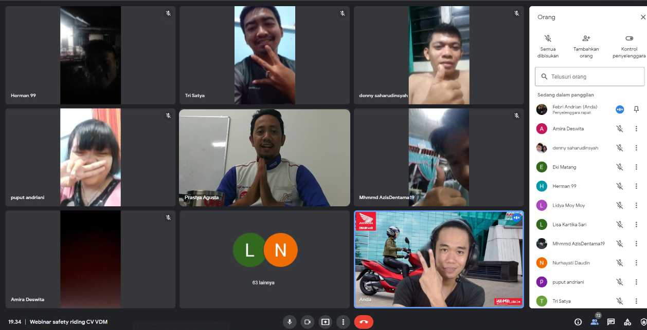 Pada hari Jumat tepatnya tanggal 25 Maret 2022 Astra Motor Kalimantan Barat memberikan edukasi keselamatan berkendara untuk karyawan dari perusahaan CV. Victory Digital Media untuk meningkatkan pemahaman #Cari_aman. Edukasi yang dilaksanakan Online ini berjalan dengan baik, dari segi pemahaman teknologi karyawan yang menopang pembelajaran secara online. Keseruan juga menjadi data tarik peserta untuk tetap aktif ketika mengikuti edukasi safety riding ini.