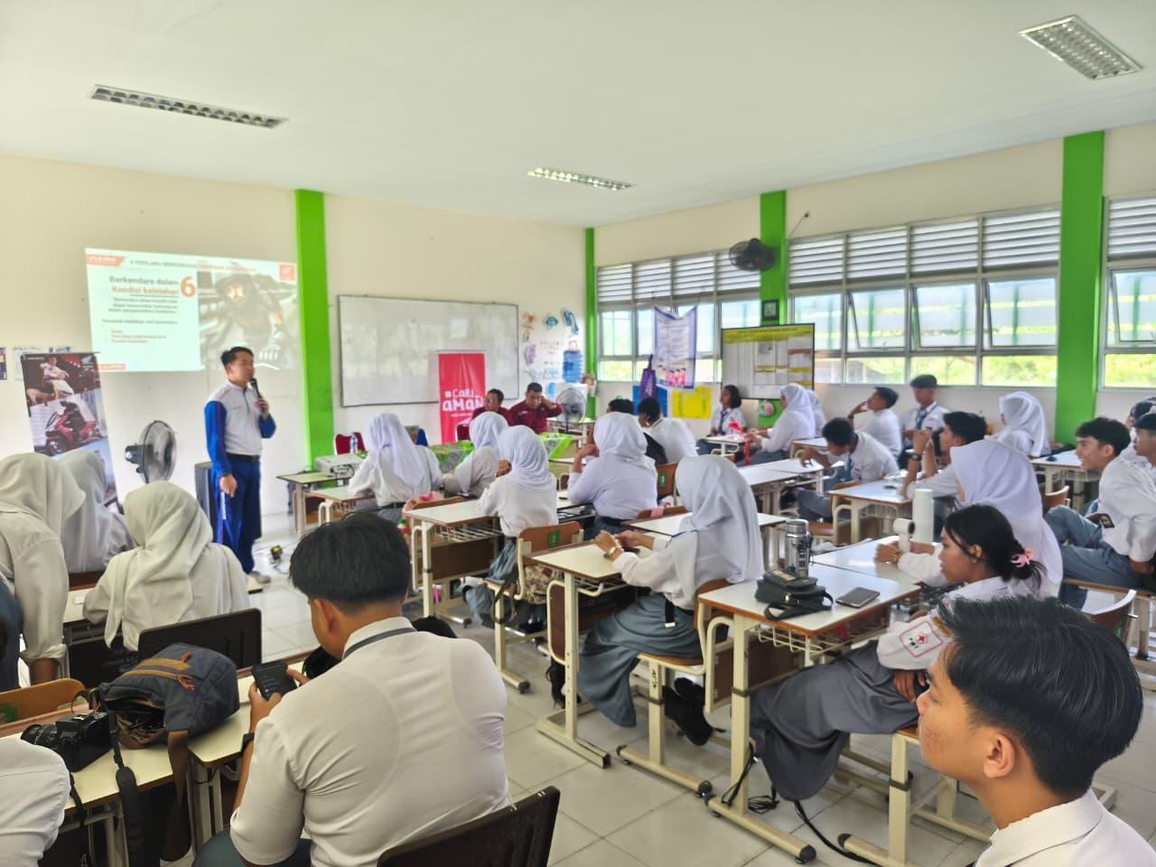 Materi disampaikan langsung oleh Febri Andrian selaku Instruktur Safety Riding Astra Motor Kalimantan Barat. Dalam sesi ini, siswa mendapatkan pemahaman mengenai teknik berkendara aman, pentingnya penggunaan perlengkapan keselamatan, kemampuan memprediksi bahaya di jalan, serta sikap disiplin saat berkendara. Penyampaian dilakukan dengan metode interaktif sehingga mudah dipahami oleh peserta.